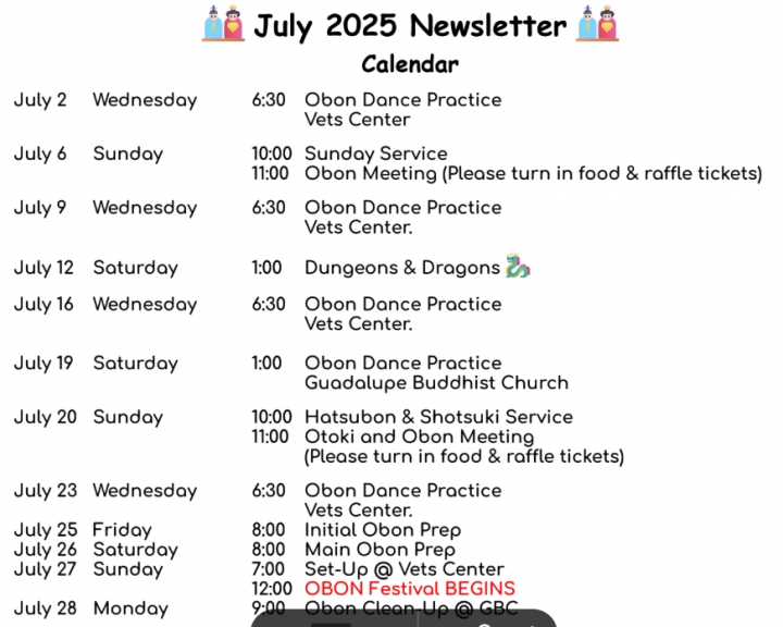first of the Obon Dance Practices is on 6/25 at the Vets Center starting at 6:30.